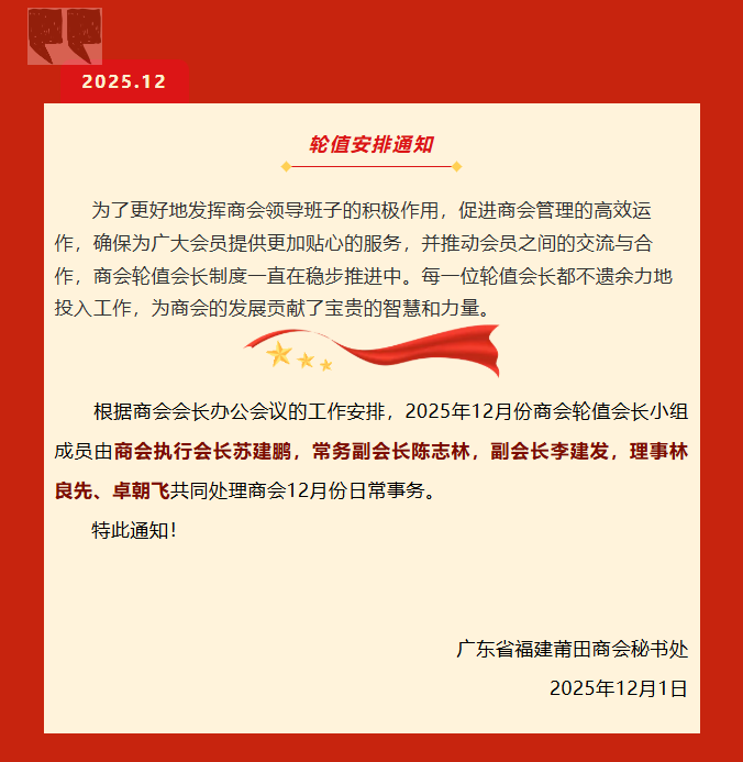 关于2025年12月份商会轮值会长小组值班通知